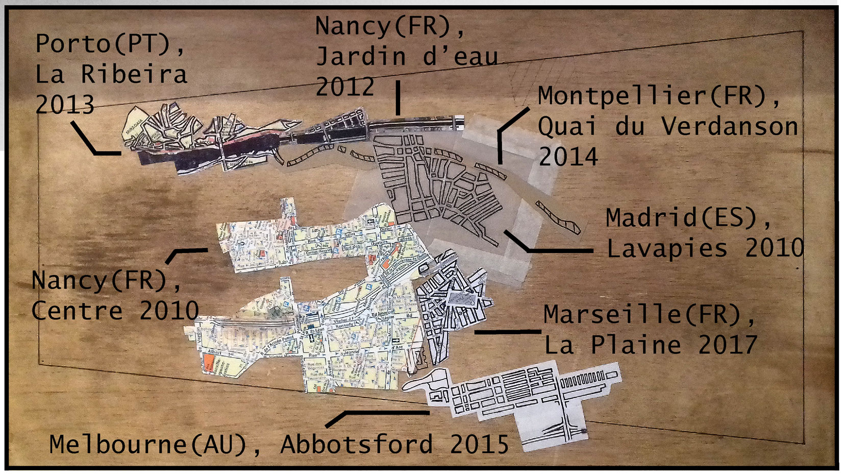 Tatouage hétérotopique, plan masse Nancy, centre-ville, Février 2010 Nancy, mise à jour, Janvier 2015 Madrid, Lavapiès, Juin 2010 Nancy, Jardin d'eau, Décembre 2012 Porto, La Ribeira, Mai 2013 Montpellier, Quai du Verdanson, Janvier 2015 Melbourne, Cliffton Hill, Abbotsford, Collingwood, Décembre 2015